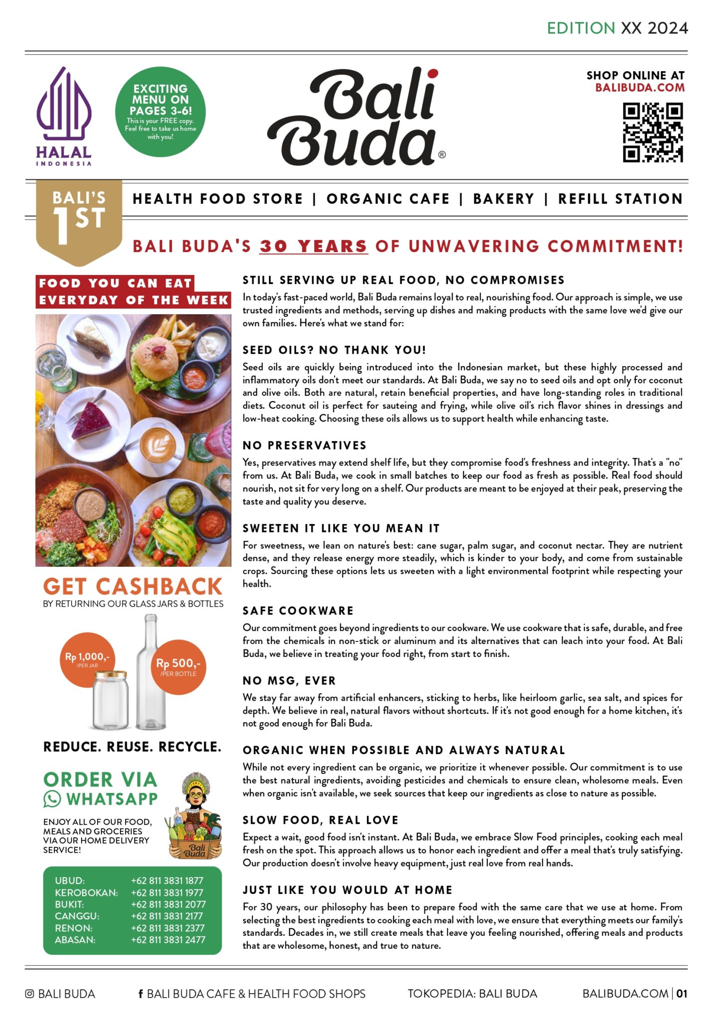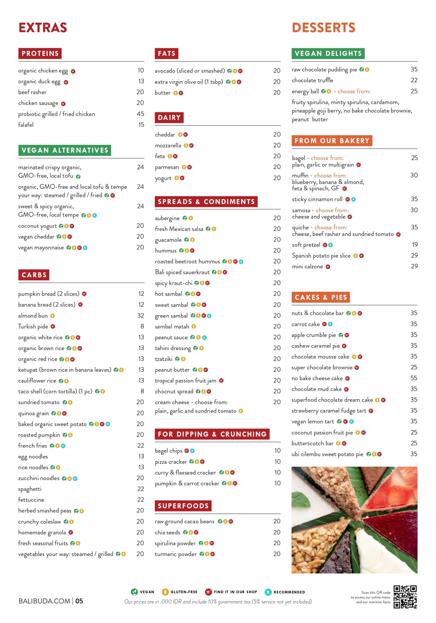 - Cassava pancakes: banana, cassava flour, eggs, coconut oil, lime, palm sugar, baking soda, cinnamon powder & Bali sea salt.