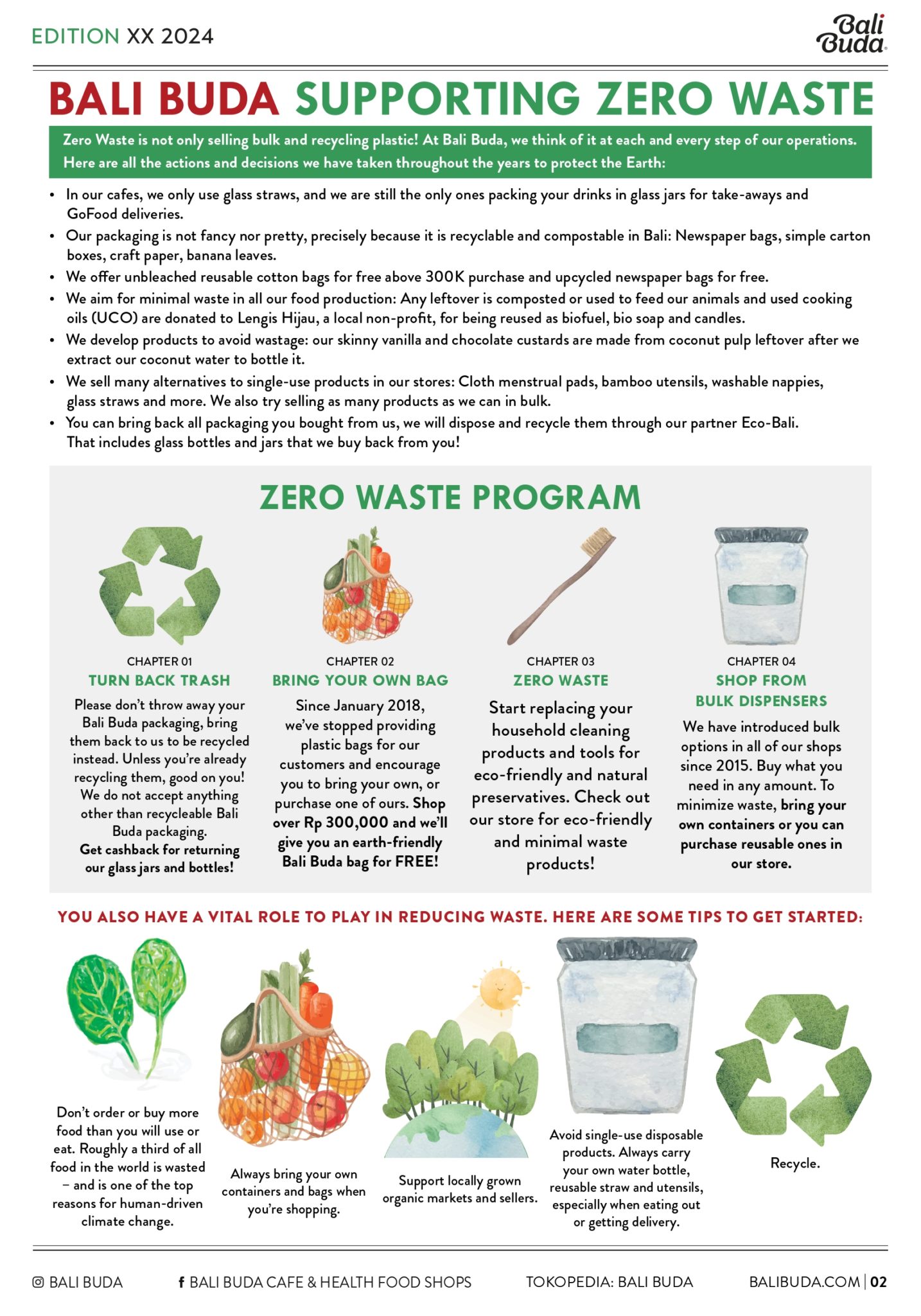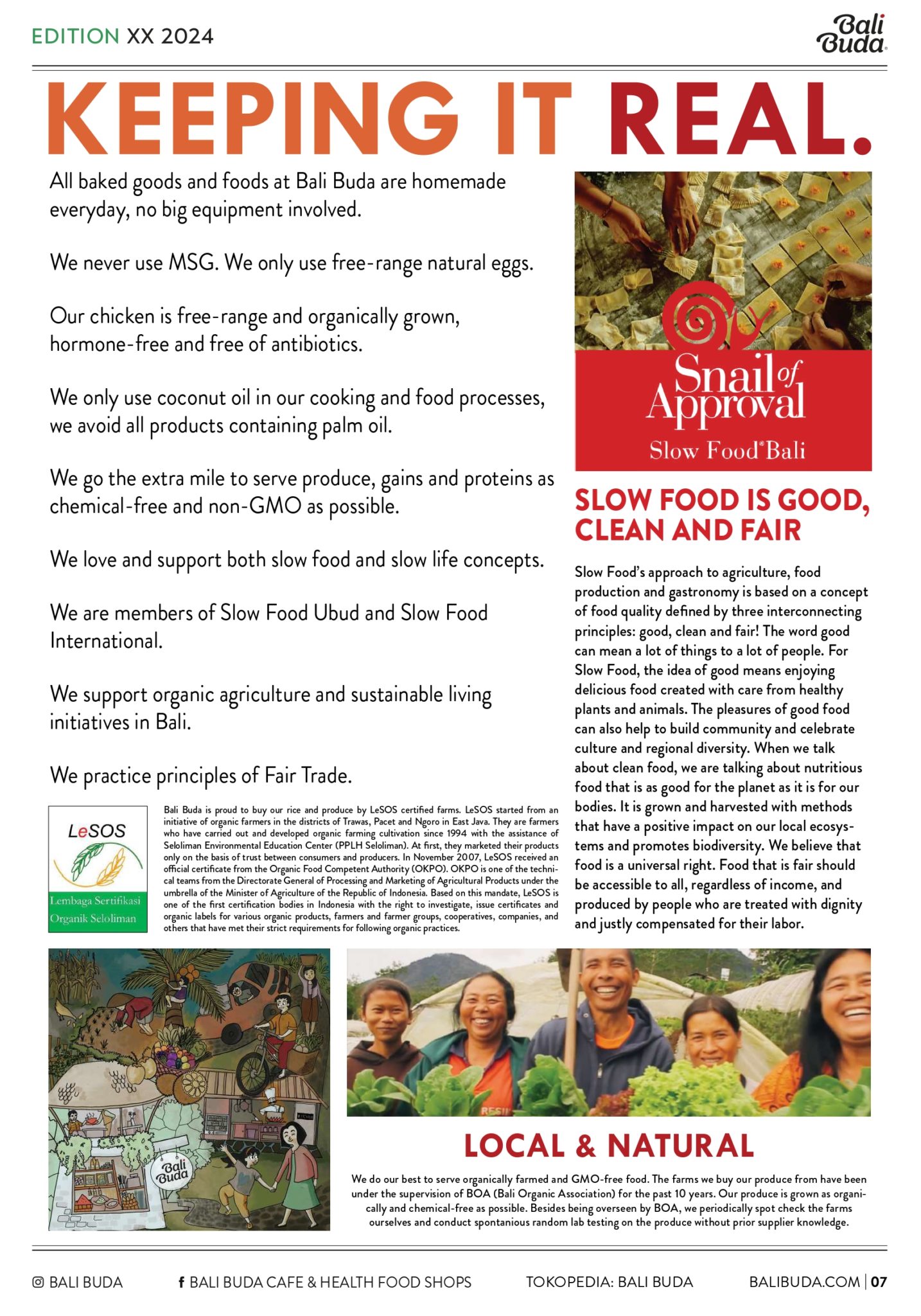 - Our signature granola (get a bag of it here): rolled oat, palm sugar, coconut oil, white sesame seeds, cashews, honey, dried coconut, peanuts, cinnamon & clove powder, raisins & Bali sea salt