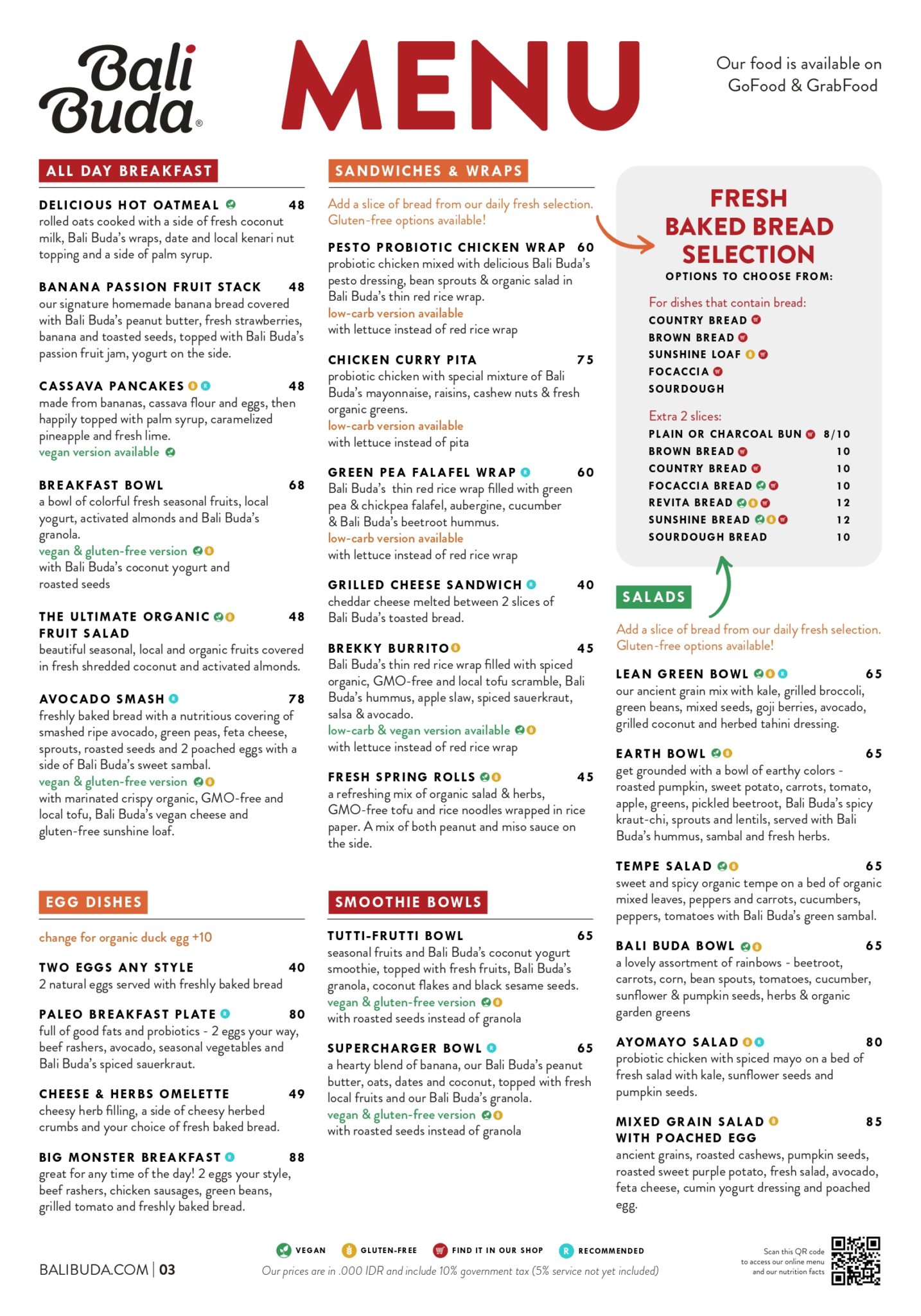 - Marinated crispy tofu: tofu, garlic, apple cider vinegar, cayenne, organic soy sauce, turmeric, cane sugar, ginger, soy milk, black & white sesame seeds, Maizena, nutritional yeast, breadcrumbs (from our gluten-free sunshine bread) & Bali sea salt.