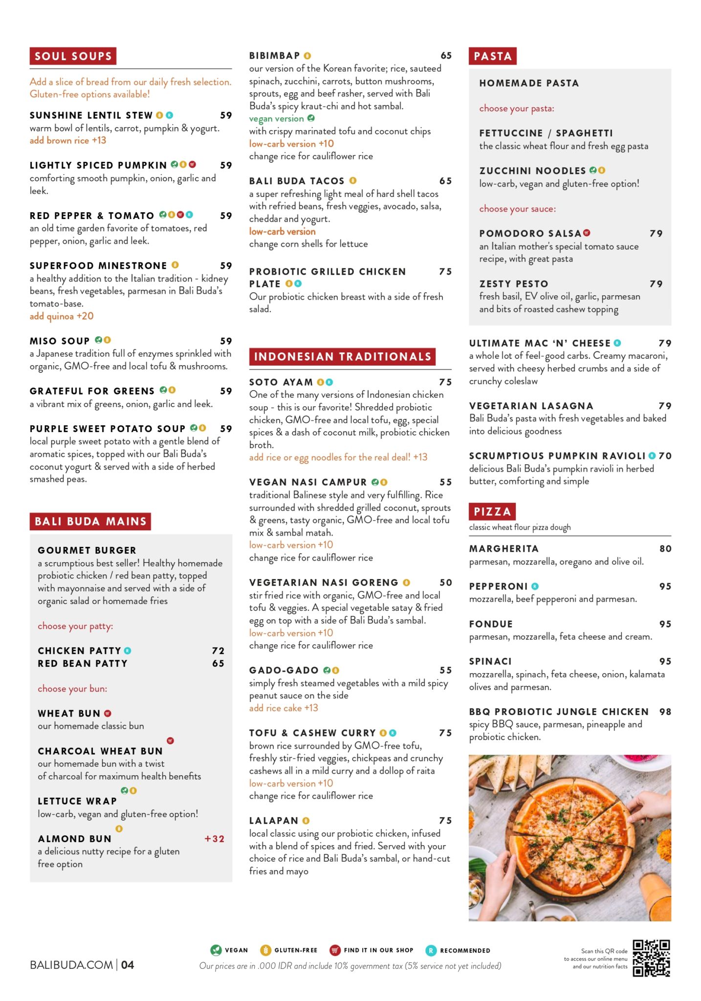 - Side: our homemade Bali spiced sauerkraut (buy a jar here): white cabbage, Chinese cabbage, jicama, carrot, cucumber, green-red-yellow peppers, Bali sea salt, shallots, red chili, curry powder, fennel seeds, ginger, licorice, star anise, cinnamon stick & clove