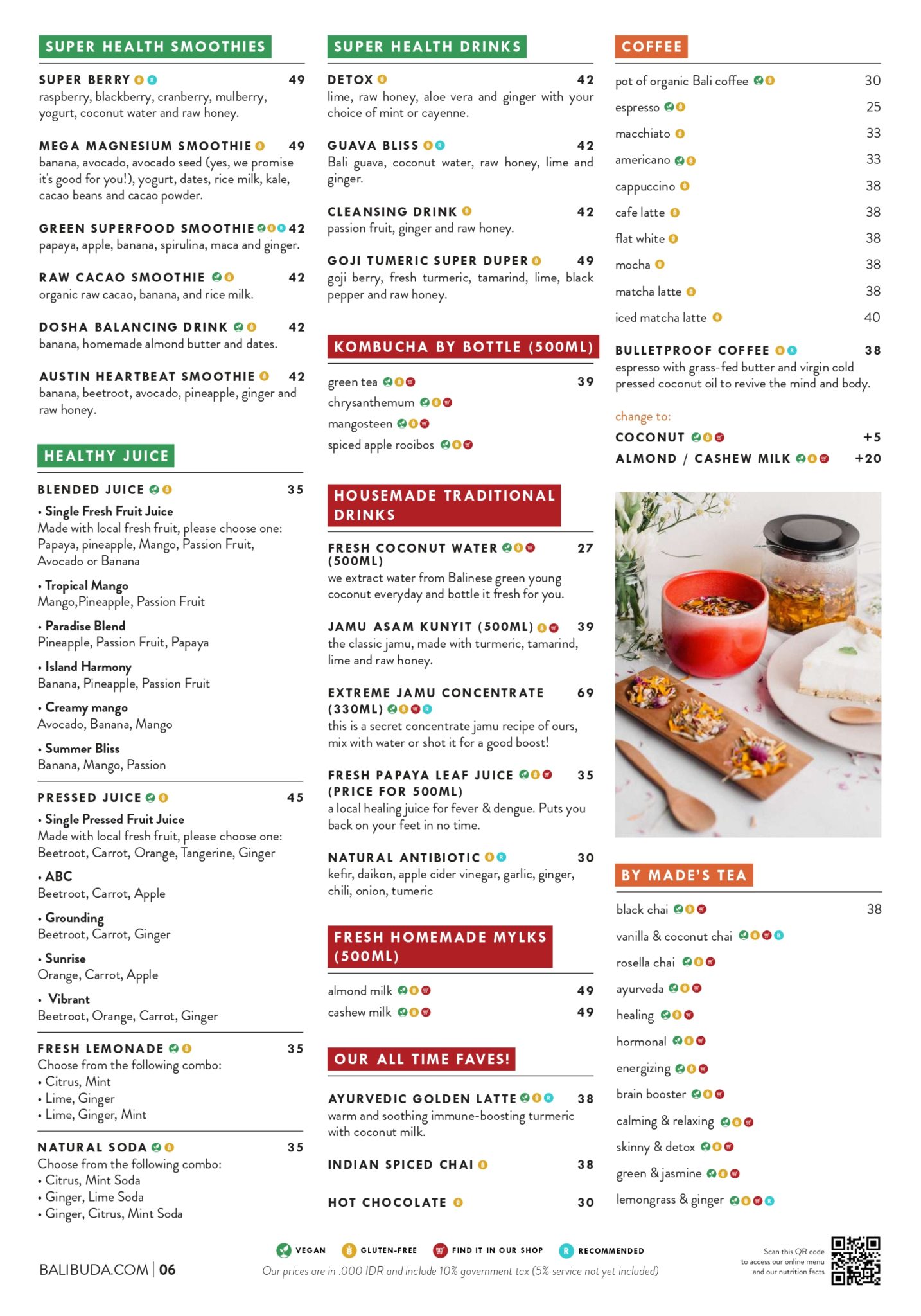 - Our homemade red rice wraps: organic red rice flour, egg, coconut oil, coconut cream, water, Bali sea salt & cracked black pepper