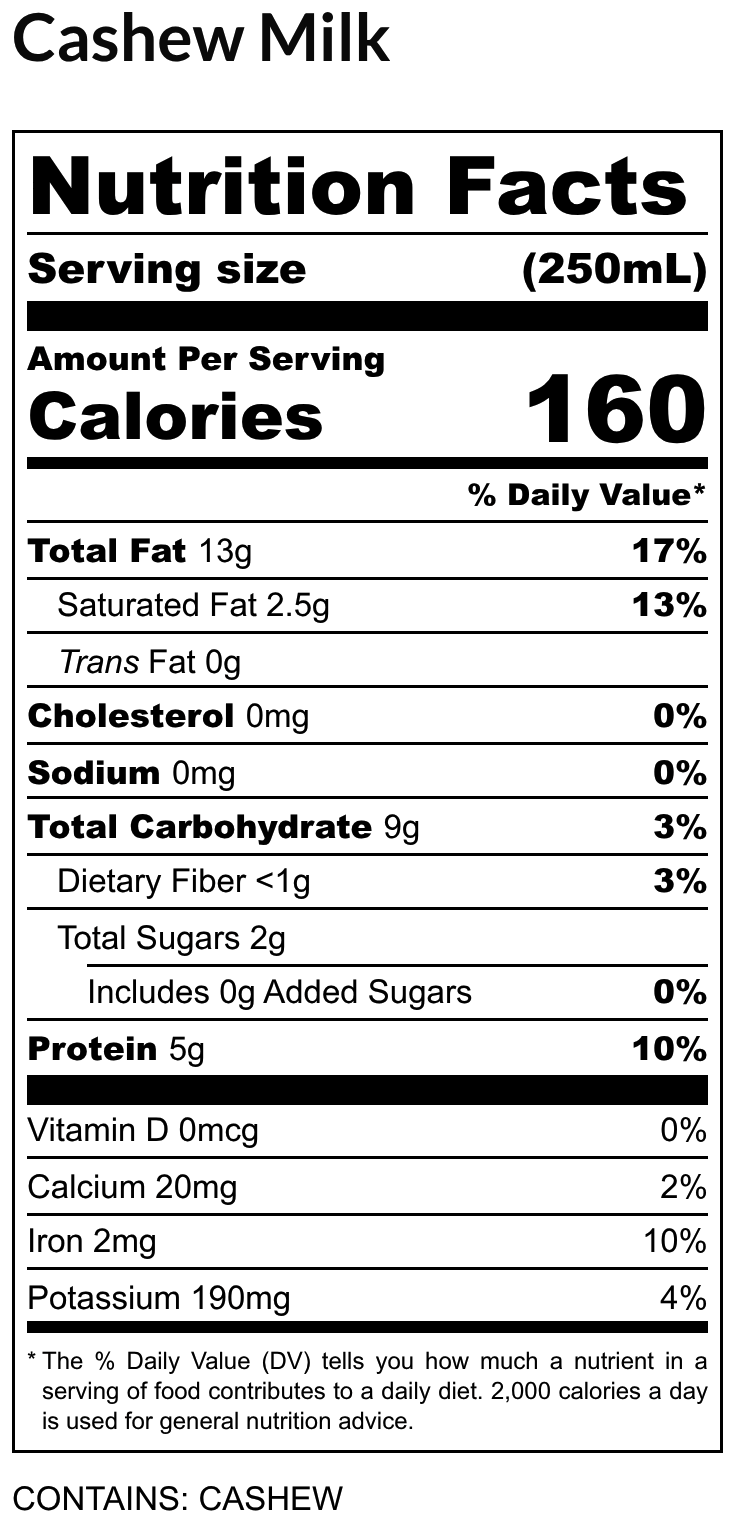 Cashew Milk is a luscious and dairy-free milk made from one of nature’s most beloved nuts, the cashew. We use organic cashews that we source from an independent collective in Wonogiri, Indonesia, that supports small-holder farmers and their families. Then we squeeze the fresh, raw cashews to extract the milk and bottle it for you. We don’t add salt, sweeteners, or flavorings – it’s just 100% pure cashew milk.