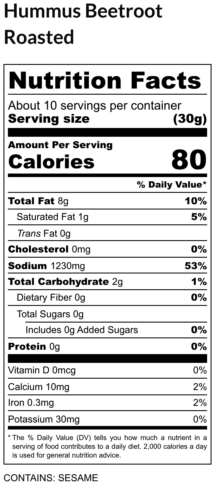 Creamy classic Middle Eastern spread with a dark pink twist from organic beetroots, our homemade Roasted Beetroot Hummus is a creamy and flavorful delight that captures the essence of Mediterranean cuisine. This versatile spread, made with love and meticulous attention to detail, embodies the simple goodness of chickpeas, fresh beetroots, our homemade Tahini, extra virgin olive oil, garlic, lime and cumin —a true representation of Mediterranean flavors. It’s a versatile and beloved dip that brings the Mediterranean spirit to your table.