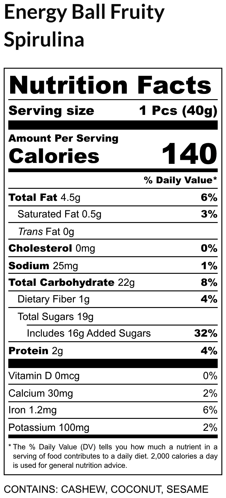 Perfect for a post-workout snack, a mid-afternoon pick-me-up, or a healthy dessert alternative, our Fruity Spirulina Energy Ball is a convenient, nutrient-dense snack that combines flavor and wellness in every bite.