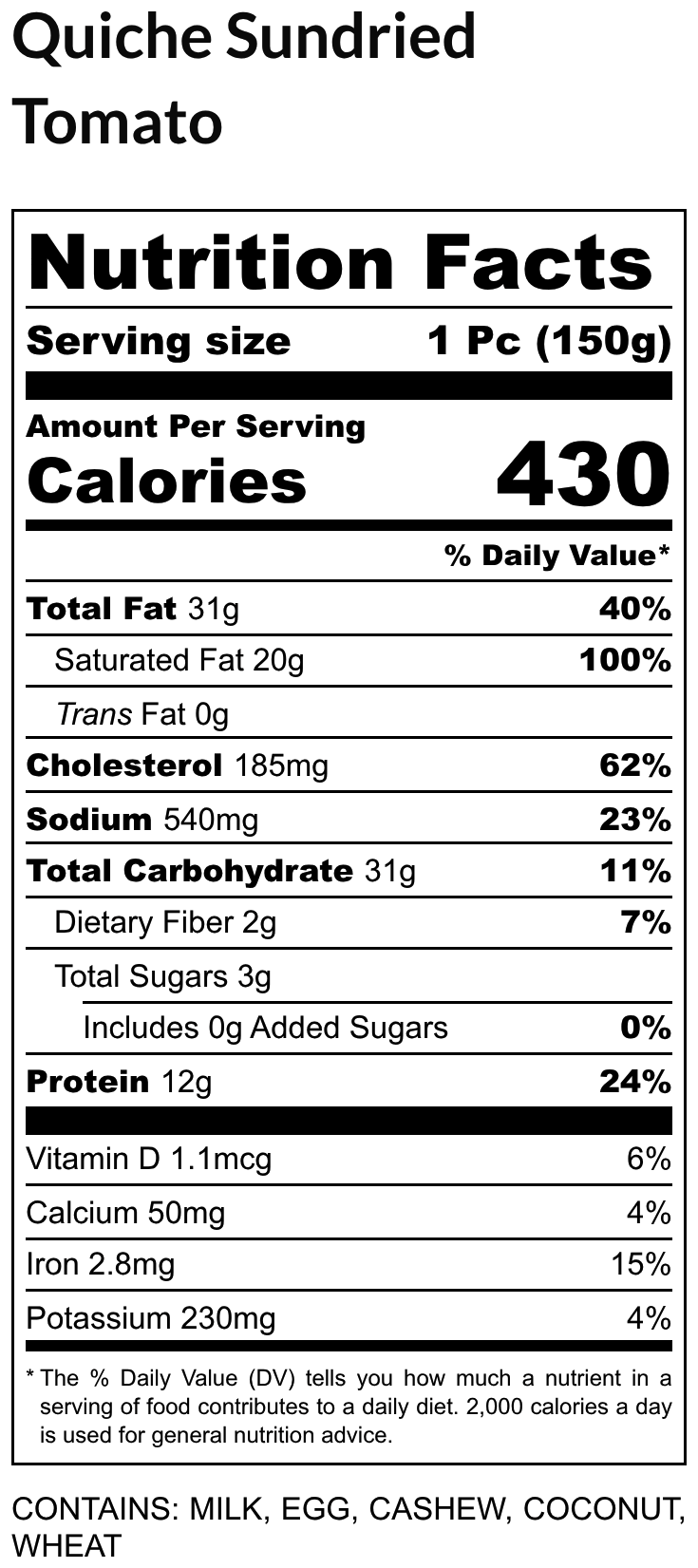 Our homemade Sundried Tomato Quiche is a veggie twist on our classic quiche. We use sun dried tomatoes for a tart, tangy flavor and cashews for extra protein, all this, inside a perfectly crafted crust.